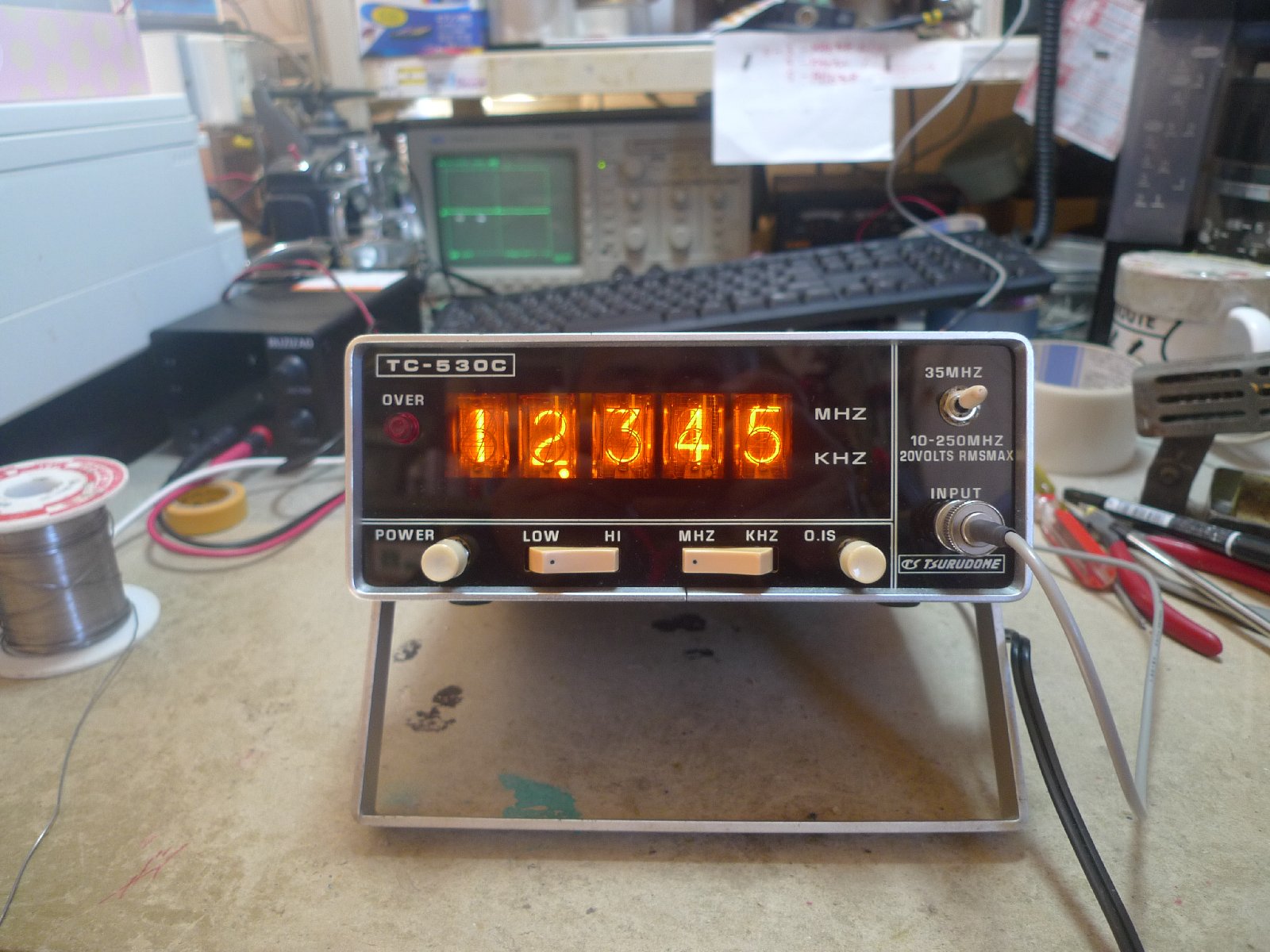 基盤にニキシー管を載せて、高圧をかけて、1本ずつ、0-9まで、IC側をプルダウンする事で表示させ、ハンダが正しく回っているか、確認しました。
